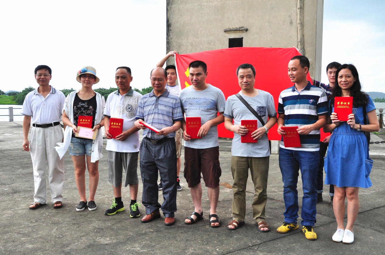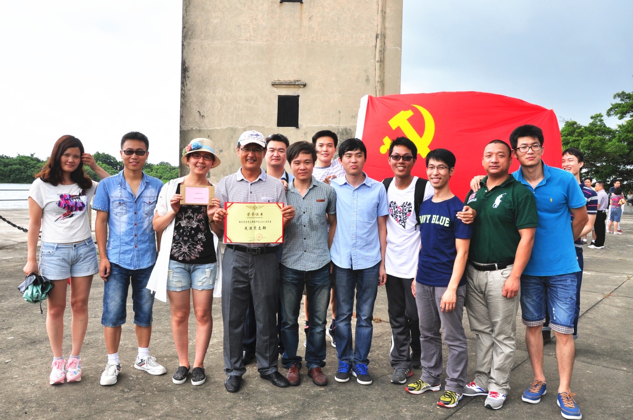 參觀當(dāng)天,艷陽高照,在歡聲笑語的旅游車上,建黨紀(jì)念活動首先在熱烈的黨史知識有獎問答競賽拉開了帷幕。當(dāng)答題告罄,獎品紛紛易主時,汽車就抵達(dá)開平南樓。該樓建于1921年,樓高七層19米,每層均有機(jī)槍和探照燈,是司徒氏人為防盜賊而建。抗戰(zhàn)時期,七名歸僑及僑屬青年曾在此堅(jiān)守八天九夜痛擊日軍,最后彈盡糧絕,壯士全部捐軀。七壯士雕塑雄壯威武,英靈如塔,藍(lán)天之下,民族精神直沖云霄。我們就在當(dāng)年這一浴血奮戰(zhàn)的所在默默地緬懷,莊重地對獲得2015年度先進(jìn)黨支部和優(yōu)秀黨員進(jìn)行表彰,展開鮮艷的黨旗合影……過程中,我們幾乎聽到烈士群像的呼吸。